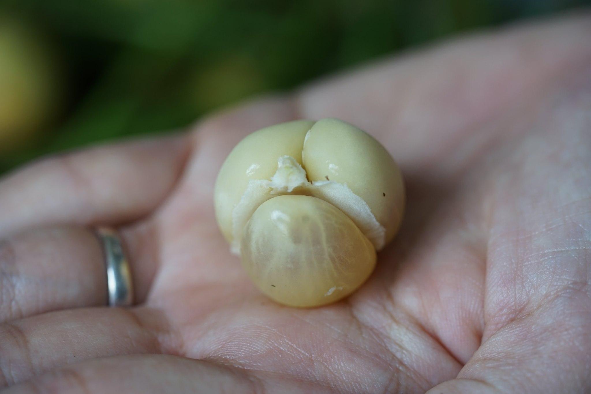Inside each fruit are 3-6 segments corresponding to the number of seeds. The translucent, juicy flesh surrounds the seeds, which vary in size. Some seeds are edible, though they typically have a bitter taste. What makes langsat unique is its natural ability to divide into segments, much like citrus fruits, but with a softer, less fibrous texture. The fruit has a light, delicate fragrance that is mild yet pleasantly refreshing.